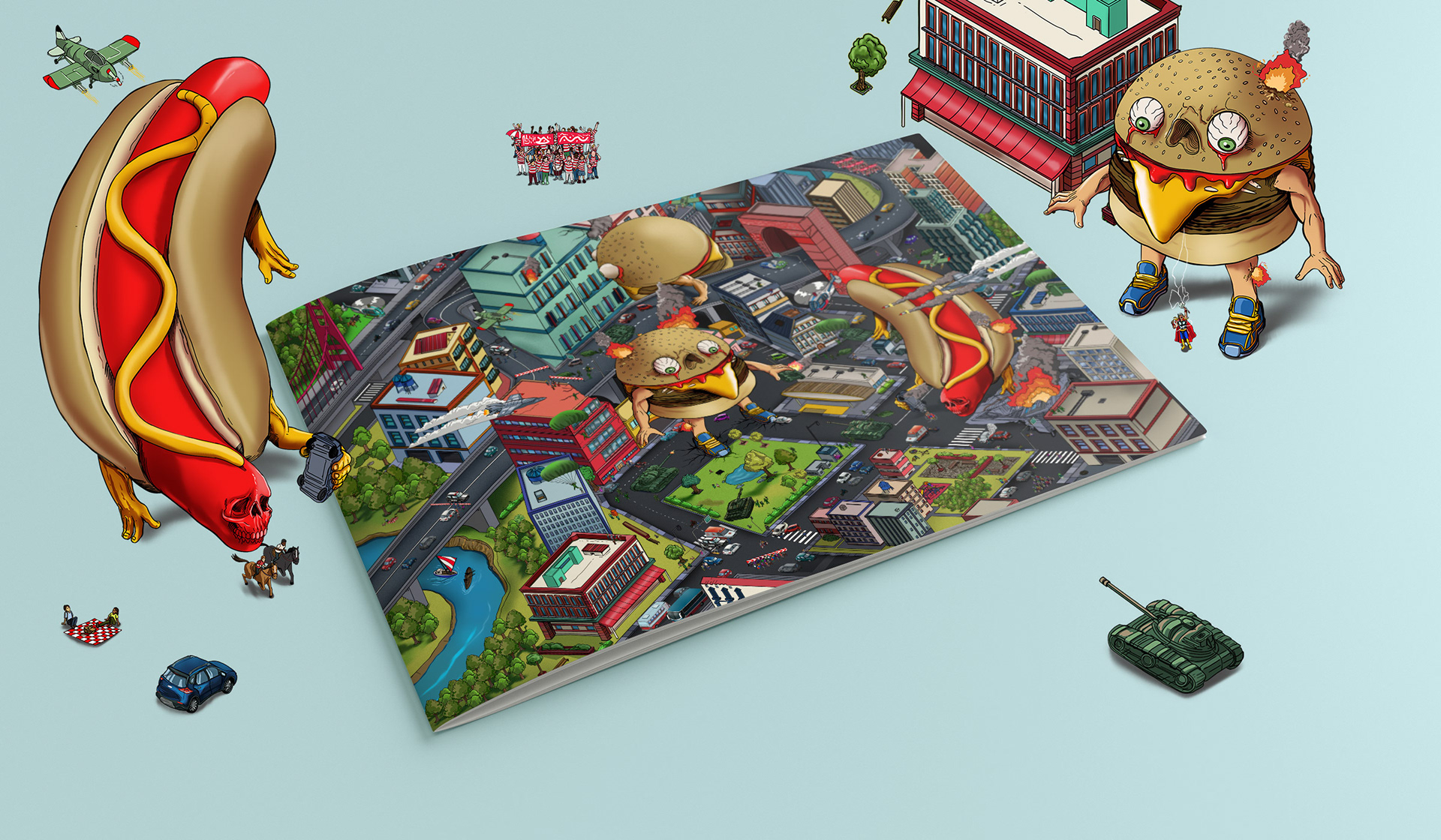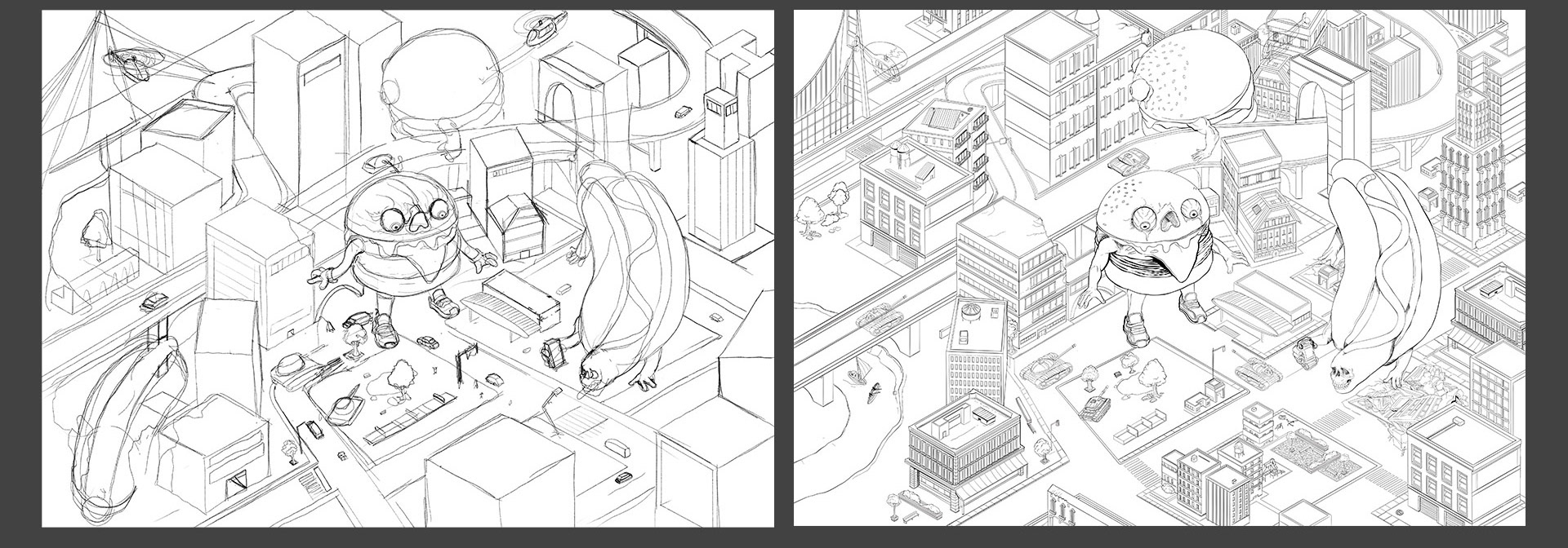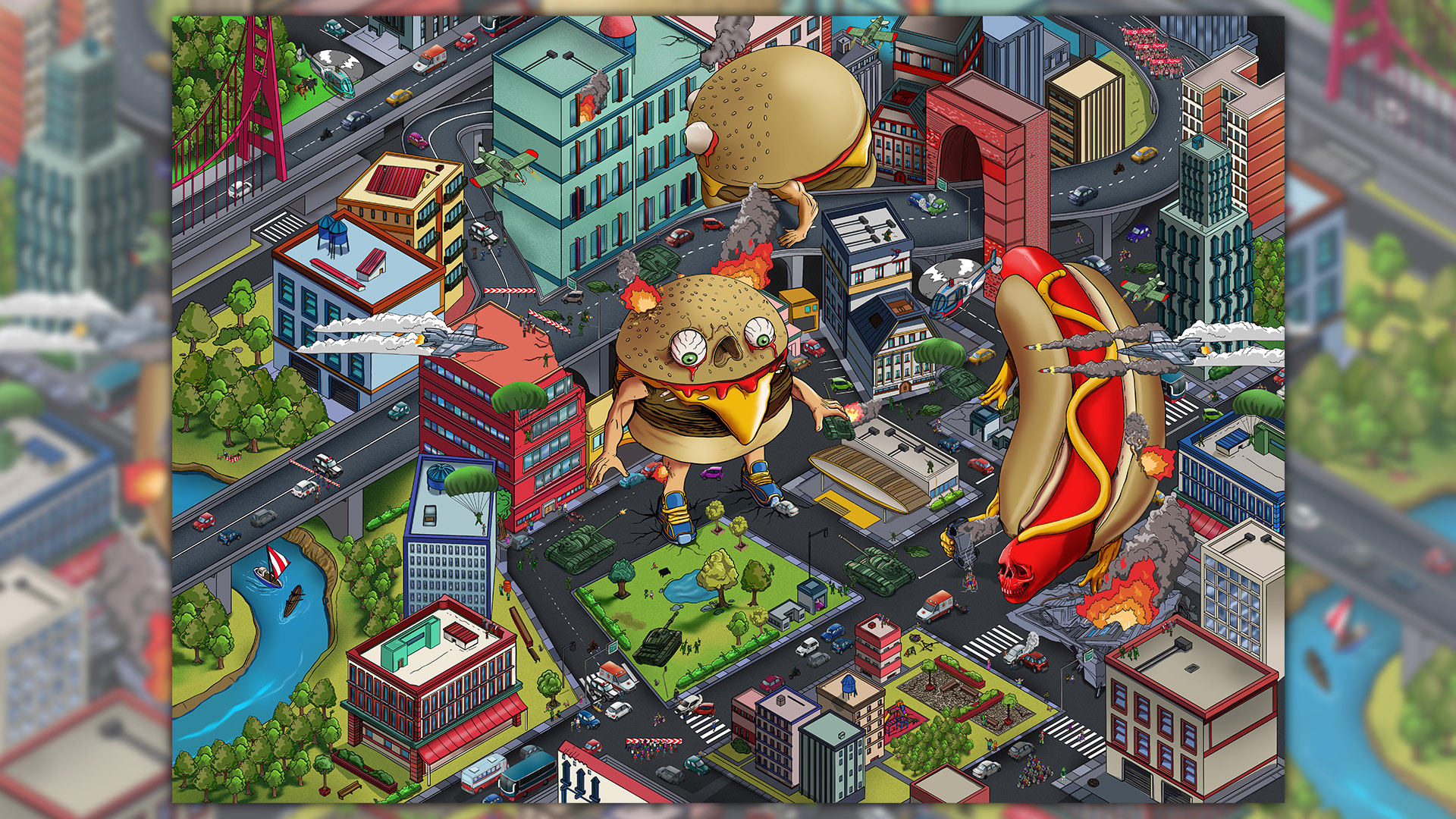Concept: This is a funny attempt to make furious fast foods overtaking the city. Hamburgers and Hot Dogs found in every corners of big cities, as monsters. Added some small stories over the scene.