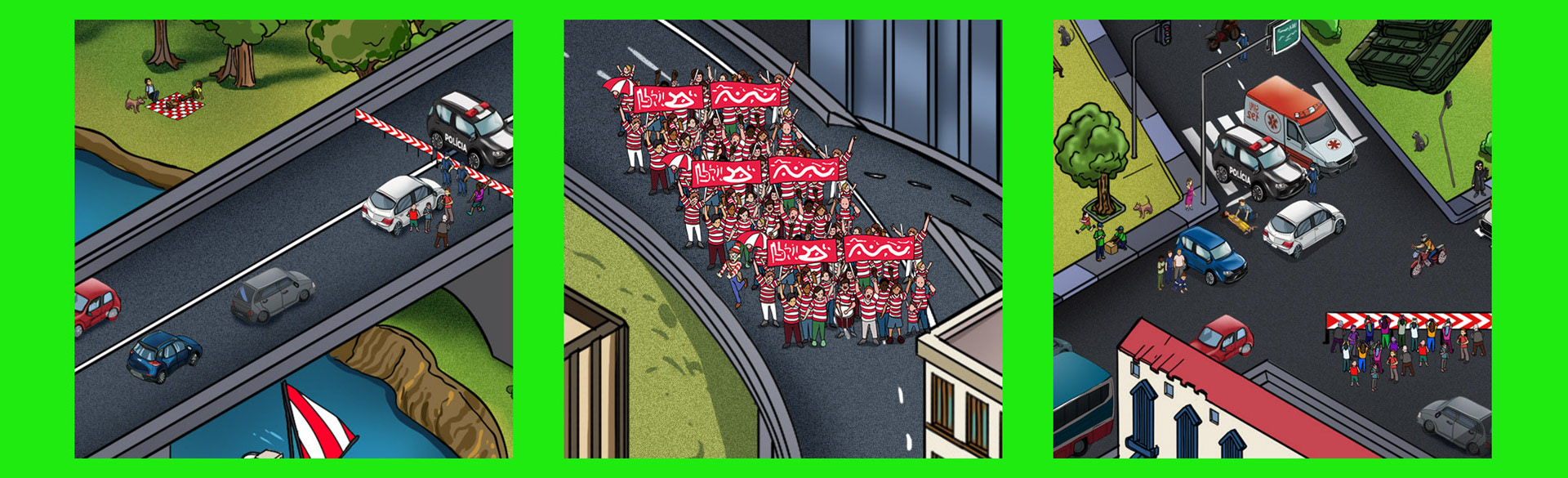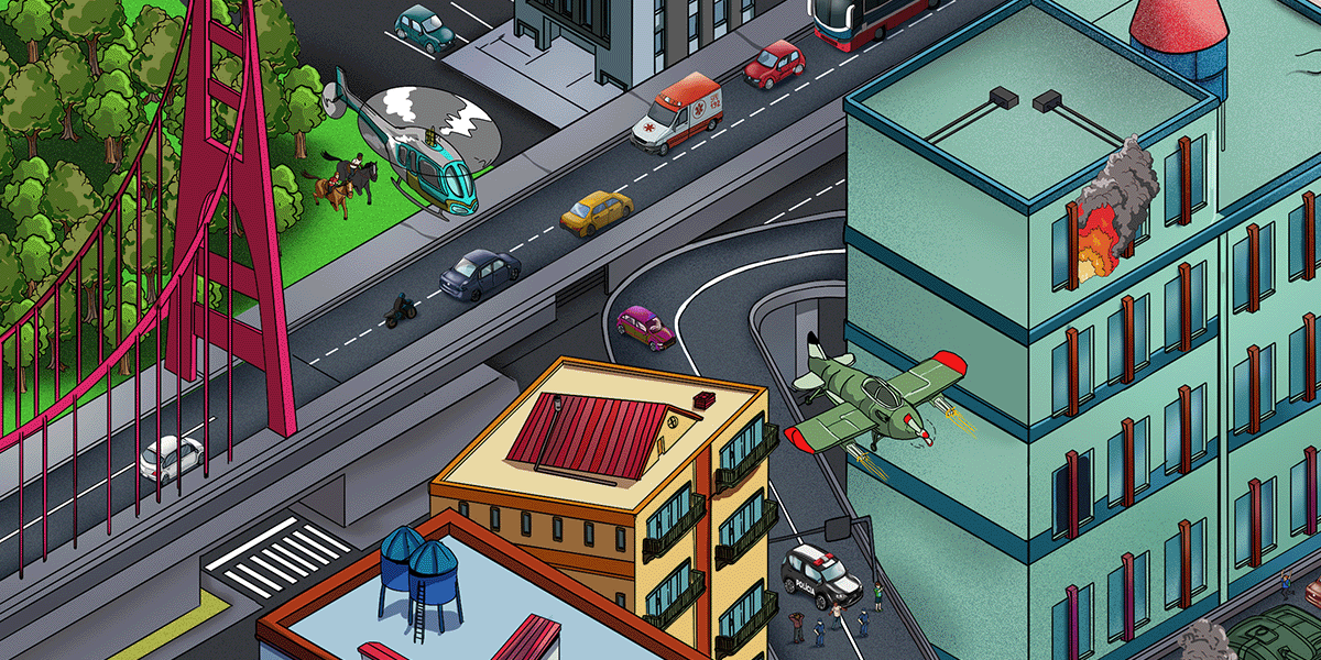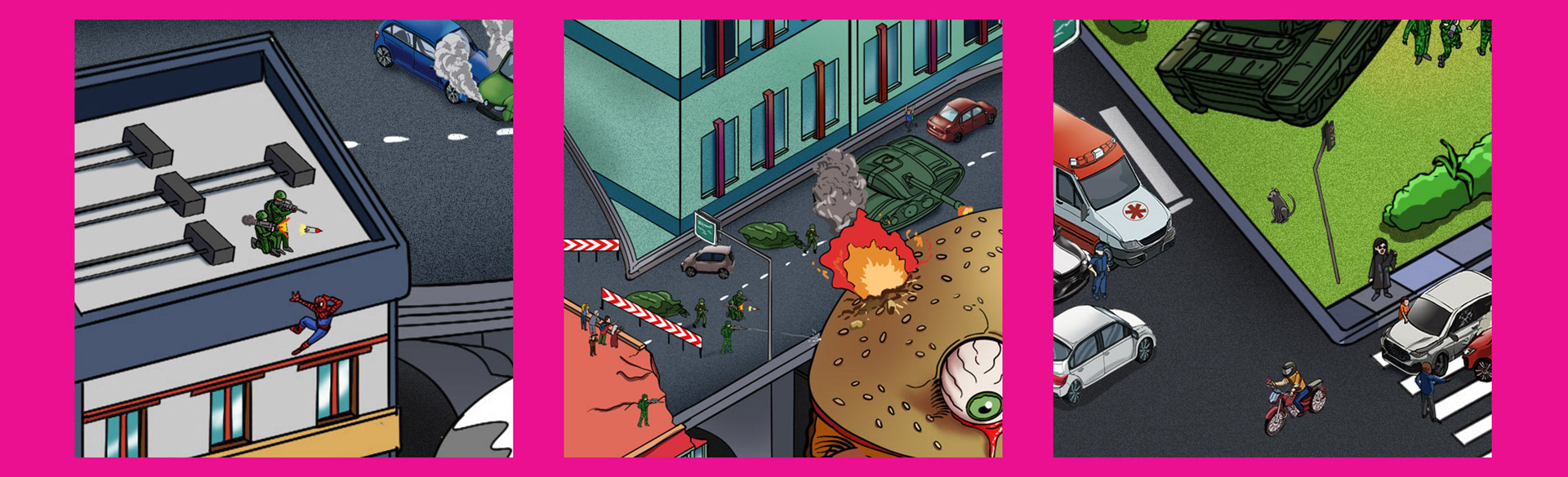 Concept: This is a funny attempt to make furious fast foods overtaking the city. Hamburgers and Hot Dogs found in every corners of big cities, as monsters. Added some small stories over the scene.